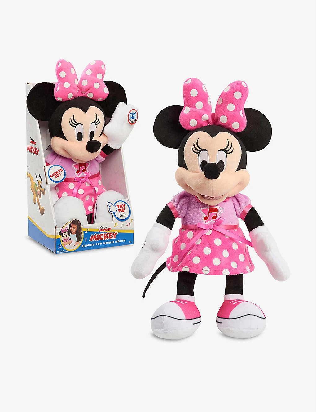 - Classic Minnie Mouse design, light-up bow, hand button